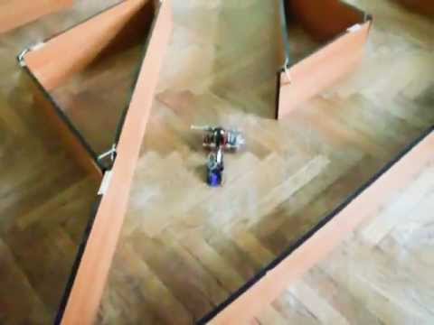 Final test of ROMBot build using arduino uno, H-bridge (L293D), parts form 2 old CD-ROMs, old optical mouse, couple screws, wheels from Castorama, IR receiver and old TV remote used for training procedure. Robot uses mouse optical flow sensor to calculate its position which is much more precise than using wheels encoders and wheel slip is not a problem as it is a case with wheel encoders.